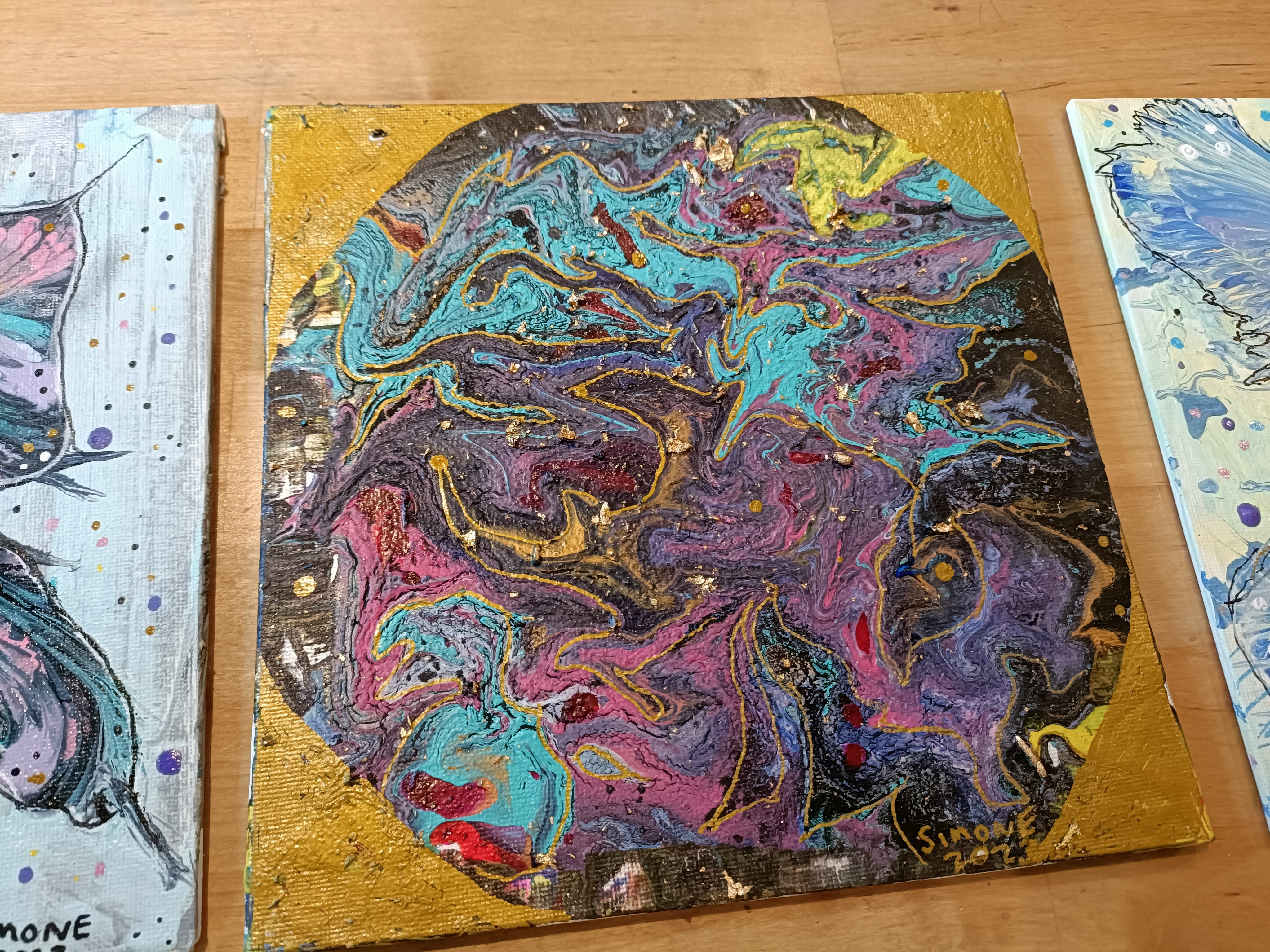 Simone’s inspiration for many of her pieces comes from her personal struggles with past domestic abuse and the inner turmoil resulting from this that lead her on a journey of healing and self discovery. Art became her healer and the firey passion and fierce fighter spirit this invoked shows itself in many areas of her art.